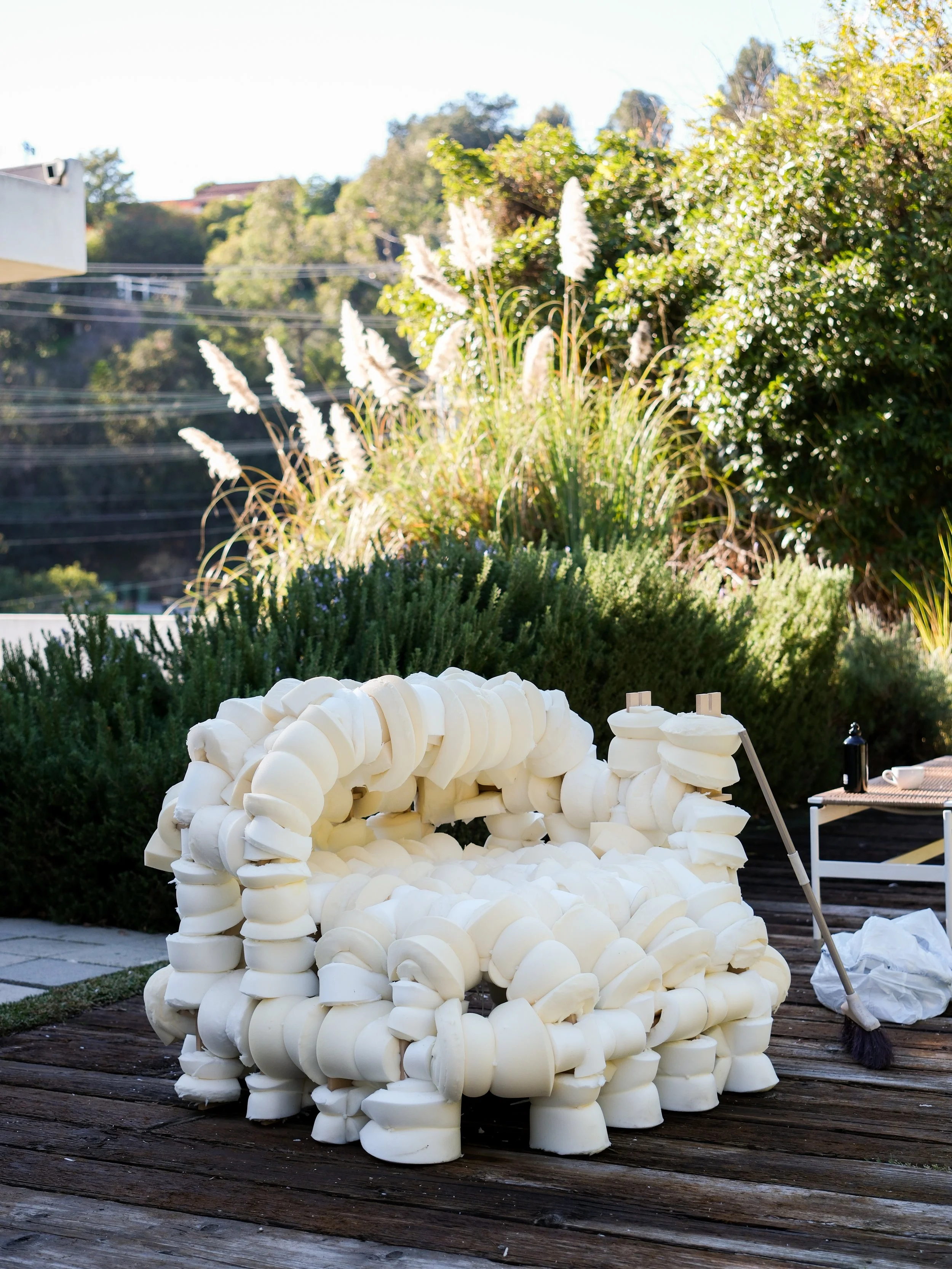 Assembling: Props for Learning is a 3-day hands-on building workshop where participants are invited to work side by side with Barcelona-based architecture studio TAKK. The workshop assembles a series of props specially conceived to accommodate activities for the first iteration of Subject Studies: Reorientations. Participants engage in a convivial and communal atmosphere within the exceptional domestic space designed by R.M. Schindler while assembling milled formwork, foam sheeting, chicken mesh, and wax paraffin into new furniture: the Isolation Daybed, the Reading Corner, the Biodiversity Lamp, and several Wax Stools. Dining, digesting, and discoursing run in parallel to the activities of assembling and building, with morning and afternoon collective meals and communal care provisions.
